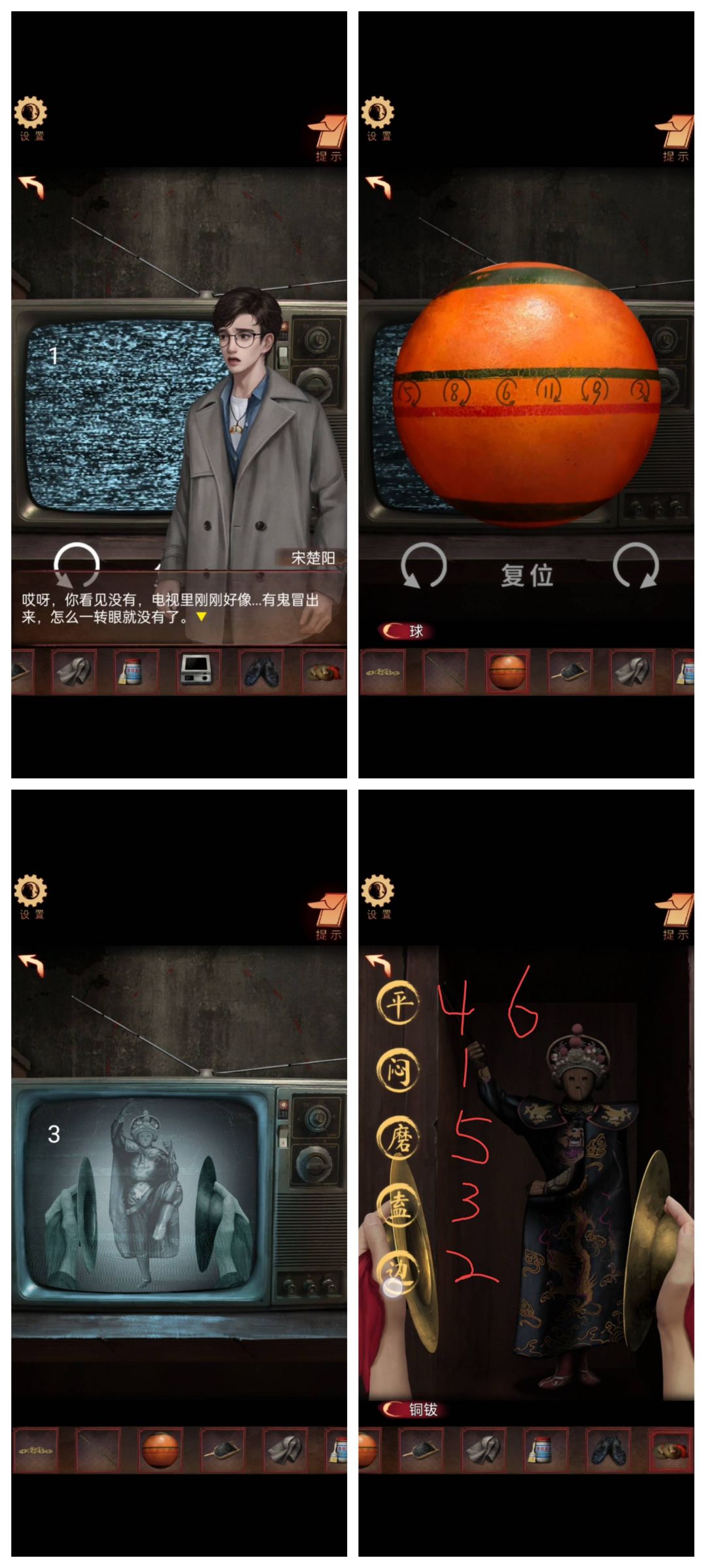 然后调电视天线,根据球调节目顺序,拿铜锣按电视顺序敲。