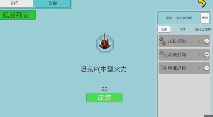然后是附加材料。首先,我第一次见到活化金有用了。。。加可以但是只能加一个,而且还挺重要。其它的。。。我也不知道加啥。这东西不咋需要电,蓄电池已经核电都不需要加。加长炮管也不重要,扩容弹和附加弹也没啥大用,就随便吧,不加了也行。