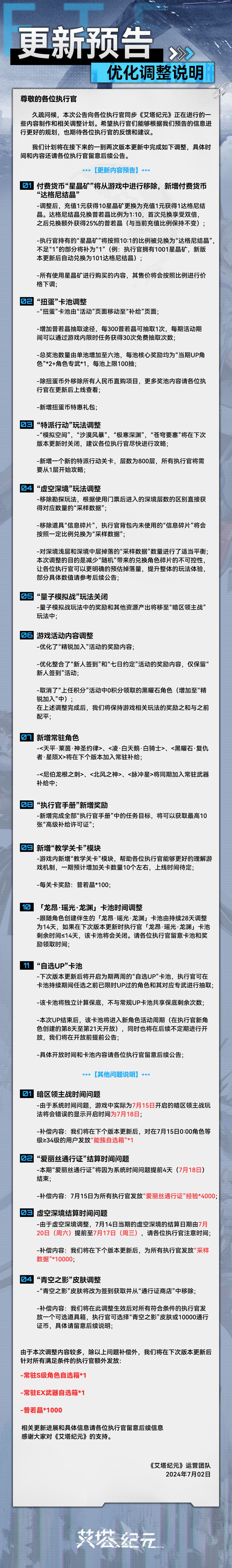 久疏问候,本次公告向各位执行官同步《艾塔纪元》正在进行的一些内容制作和相关调整计划。希望执行官们能够根据我们预告的信息进行更好的规划,也期待各位执行官的反馈和建议。