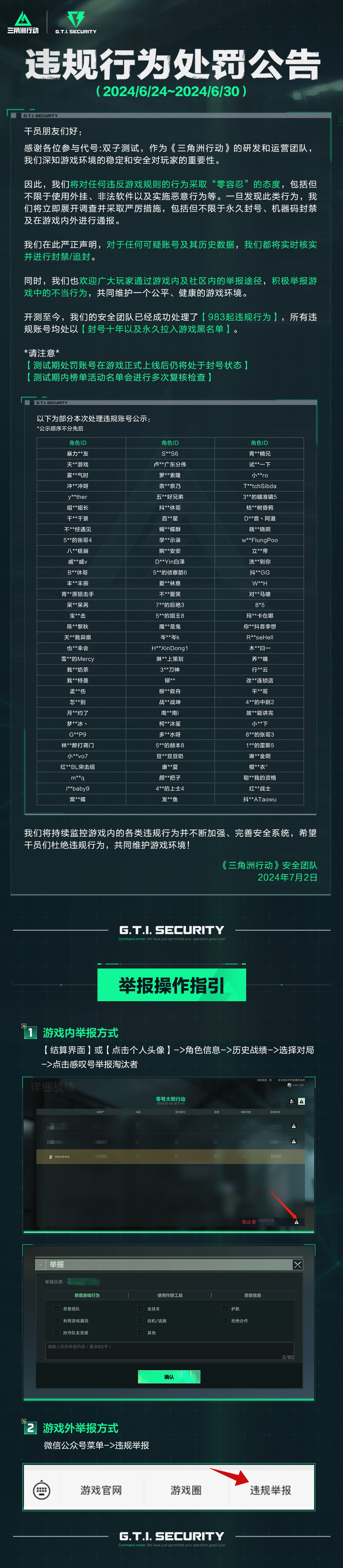 双子测试已开启一周,近期我们与安全团队对游戏内的违规行为进行了严密的防御和打击。