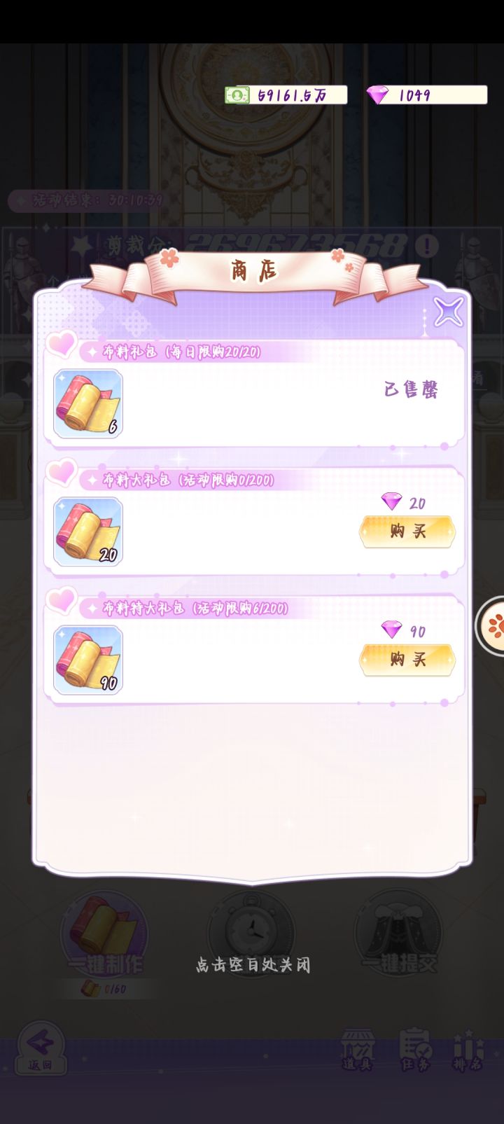 #开间服装店 #活动攻略我们所有活动都是以3天为期,在第三天的晚上9点半截止。第一张图的活动是国王的新衣,点进活动右下角会有一个商店, 一共有三栏,第一的是可以用绿色钞票买120个布匹的,后面2个就要自己用钻石买辣(所以平时有事没事也可以攒一下钻石),买到布匹之后,就制作,根据自身总员工的闪耀值来决定自身排名的高低 他有一个分数的排名榜,分数越高 奖励越丰厚,前两名都有30个金剪刀以上,第三名25 第四到第六名20个,每做一次都会给一定的通话币,在第2张图可以兑换这些东西,想换什么 依据自身来定,金色的支票可以换绿色的钞票,粉色的许愿服可以许愿以获得镯子兑换员工自行选择,还有宠物狗粮和突破等等奖励,都可以加员工的闪耀值,30个剪刀兑换一名卓越店员,像不氪金的玩家就可以多攒几期活动,这些活动都是常驻活动,多攒几期活动就会有30个剪刀啦其他奖励也是非常丰厚