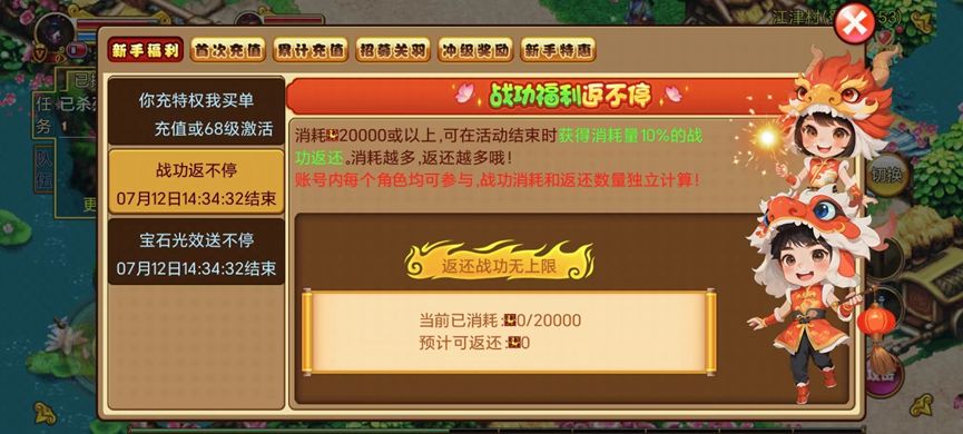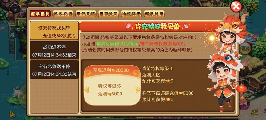 在[首充-新手福利]界面中满足指定条件,可在活动结束后获得该特权等级所需元宝100%的返利,最高可享返利20万绑元,每个账号下仅限1个角色参与!