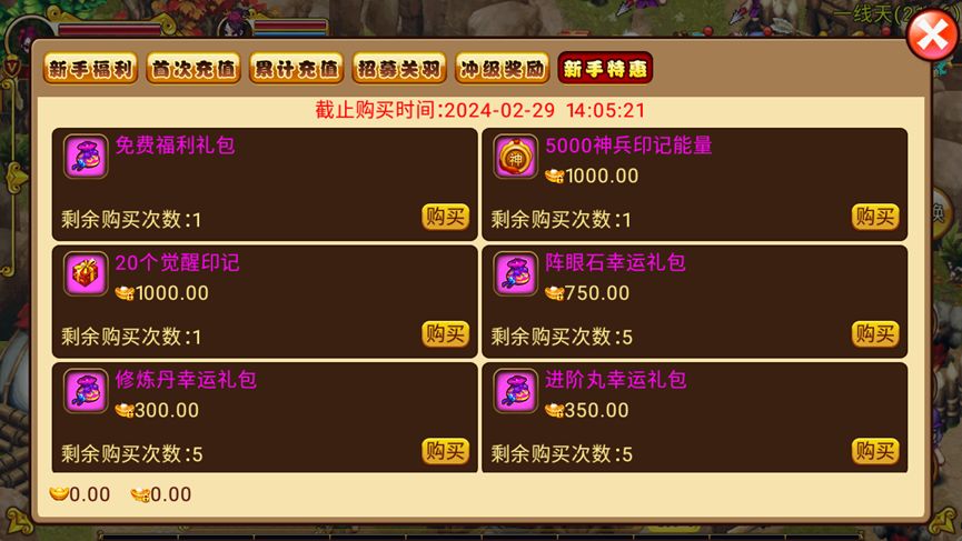 新角色可在[首充-特惠商店]中享新手价格购买神兵能量和觉醒印记等超值好礼!