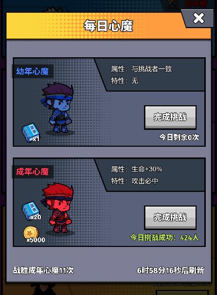 由于成年心魔没有挑战次数限制,大家可以多试几次,运气好就会挑战成功。