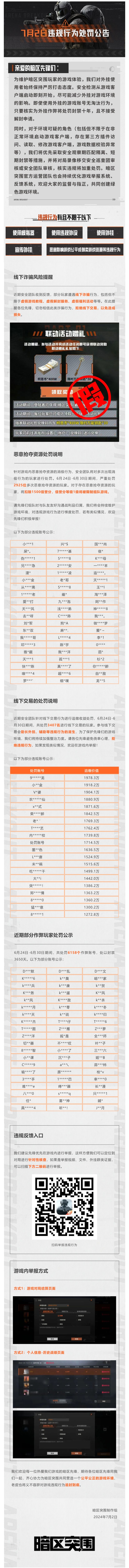 《暗区突围》手游安全风险提醒及违规行为处罚公告 -7月2日