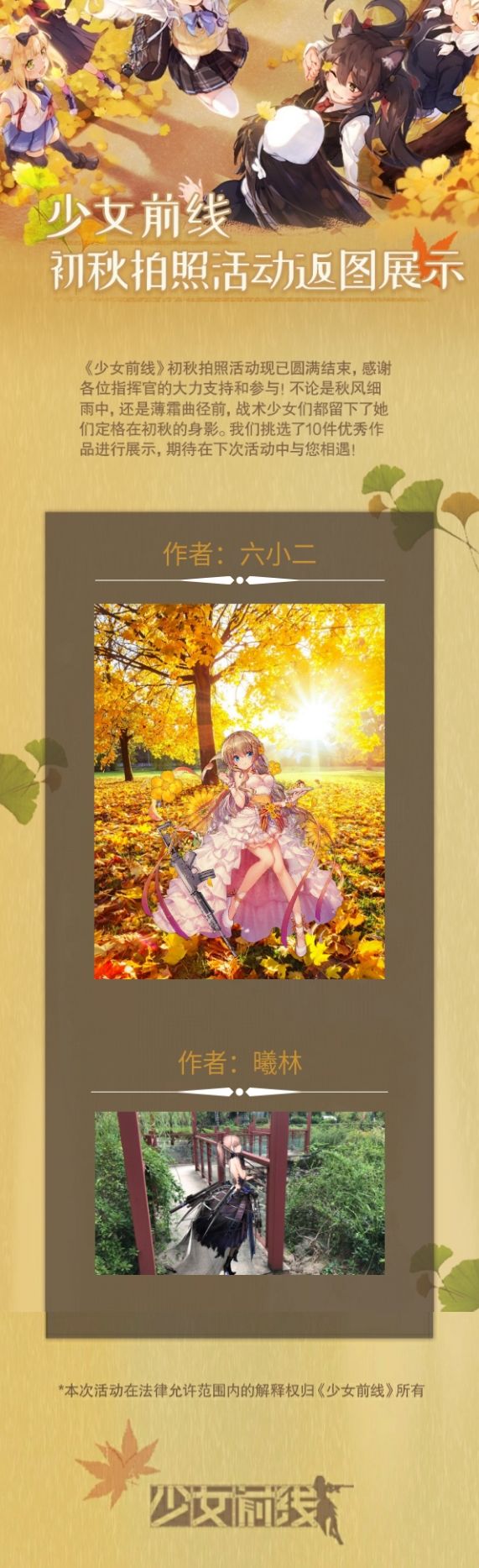 少女前线初秋拍照活动现已圆满结束,感谢各位指挥官的大力支持和参与!不论是秋风细雨中,还是薄霜曲径前,战术少女们都留下了她们定格在初秋的身影。我们挑选了2件优秀作品进行展示,期待在下次活动中与您相遇!