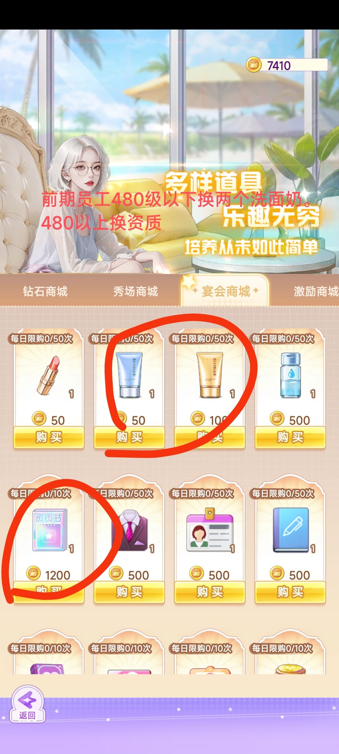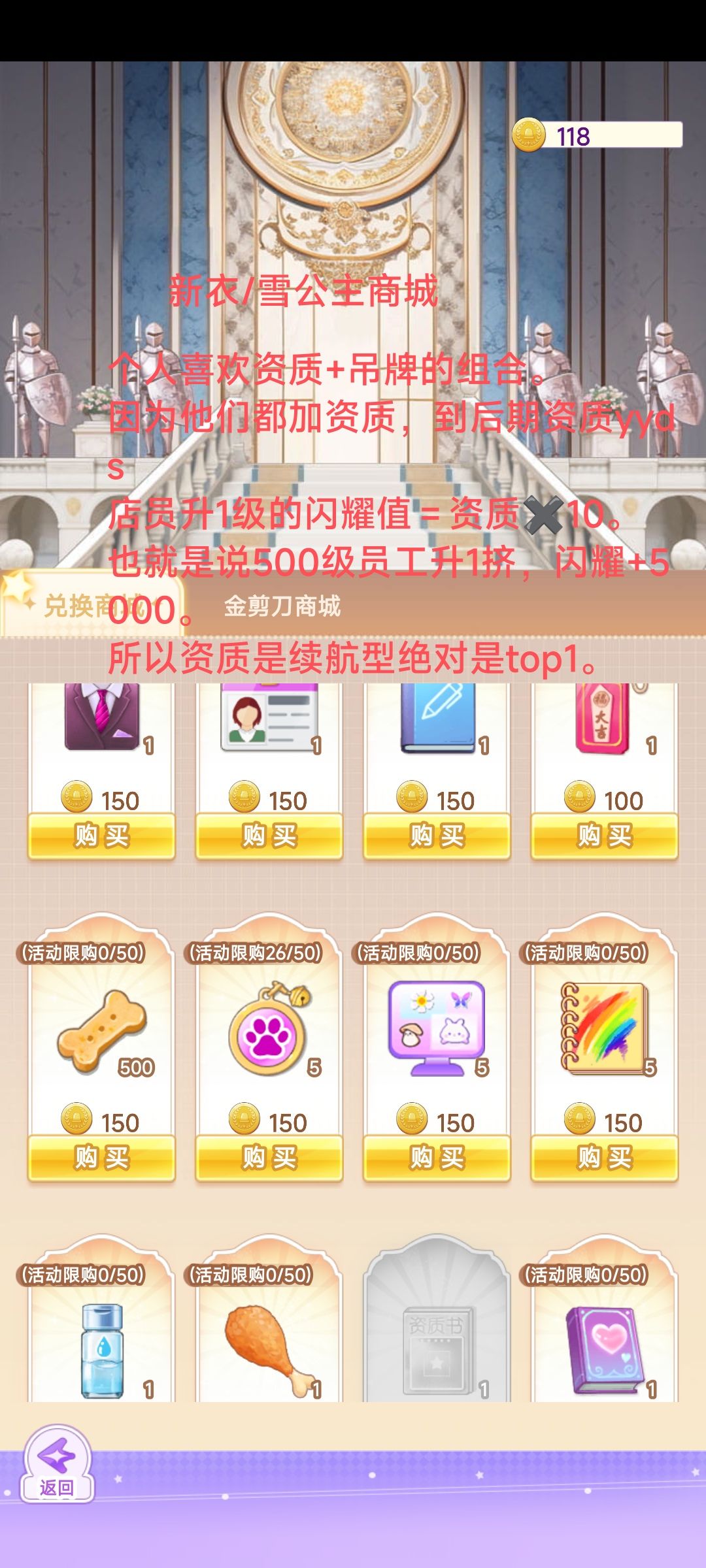 ③吊牌。前期不建议玩吊牌 吊牌也可以增加员工资质。后期当有500+级的时候,如果专注弄员工闪耀,不太注重衣服闪耀的话可以在雪公主和新衣活动换吊牌。(先资质书后吊牌)