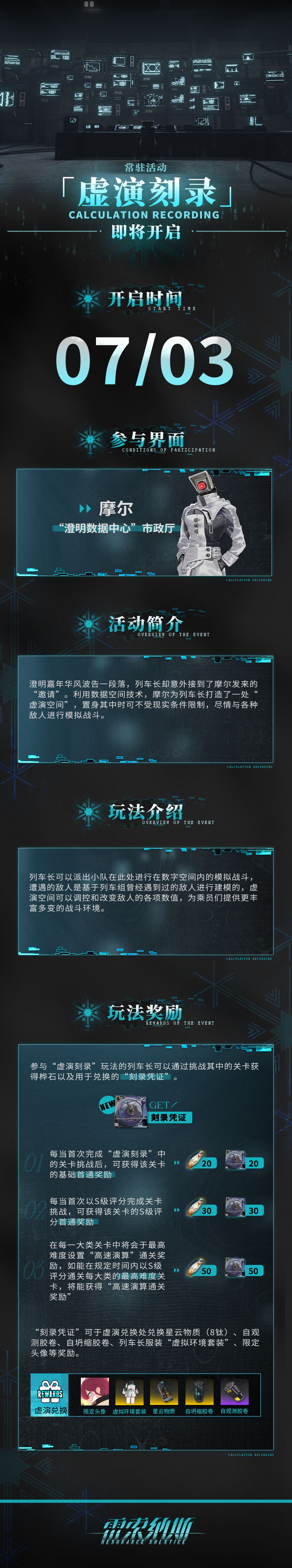 澄明嘉年华风波告一段落,列车长却意外接到了摩尔发来的“邀请”。利用数据空间技术,摩尔为列车长打造了一处“虚演空间”,置身其中时可不受现实条件限制,尽情与各种敌人进行模拟战斗。