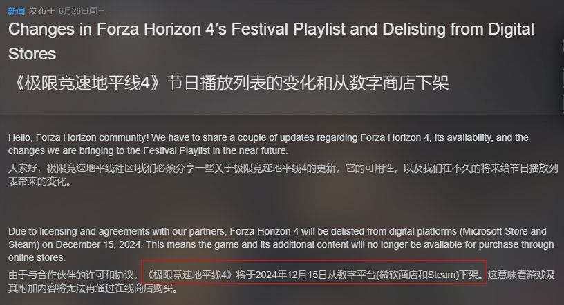 不久前,微软宣布,由于许可证的到期,开放世界竞速游戏《极限竞速:地平线4》将于2024年12月从各大数字商店下架,并停止售卖。当前在Steam商城中,地平线4的绝大部分DLC内容已经下架,仅有标准版、豪华版、终极版三个版本的游戏可供玩家购买。同时根据Steam商店页面的公告显示,受许可到期的影响,这三个版本的游戏,也将在今年的12月15日于微软商城与Steam平台同步下架。