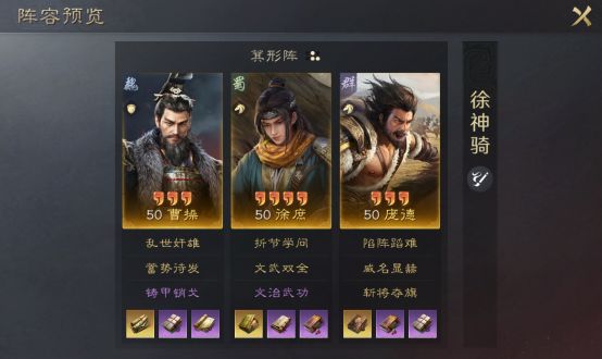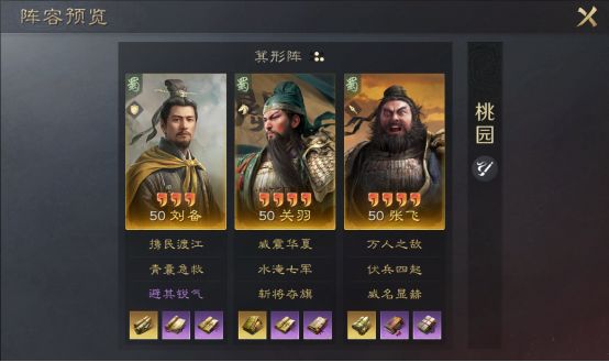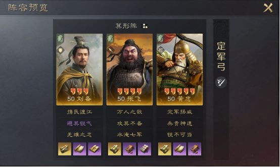 例如庞德的被动战法在特定回合后,输出将大幅度下降,这时候我们就应该配一些主动战法来提高庞德的输出能力;又或是目前比较流行的桃园阵容是通过携带攻其不备+水淹七军来达到控场效果,这就是典型的追击类战法+主动类战法的组合,但只要为了达到控制目的,我们也是可以突破常规进行排列组合的。