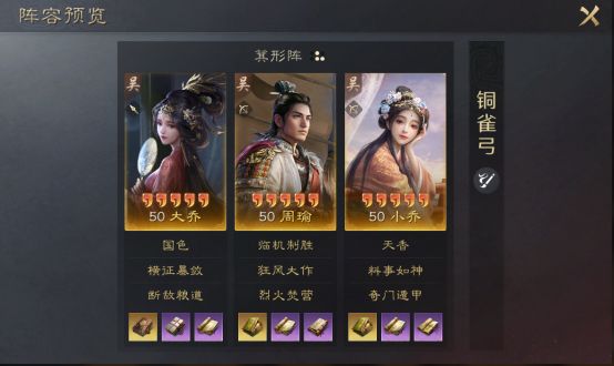 以大乔、周瑜和小乔阵容为例,周瑜自带战法临机制胜为输出核心,每回合只要有触发异常状态周瑜就可以打出成吨的输出。优点是稳定,一旦满足条件会立即判定。