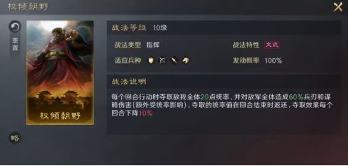 另外需要补充的是,部分指挥战法会在战法描述中明确说明其发动时机。例如董卓的战法权倾朝野,战法描述明确说明为“每个回合行动时”,因此即使权倾朝野是指挥战法,但也只会在轮到董卓行动时才会发动。