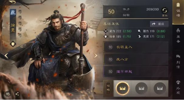 以徐晃为例,长驱直入、战八方和揭竿而起同属于主动战法,那么其发动顺序则是从上至下。