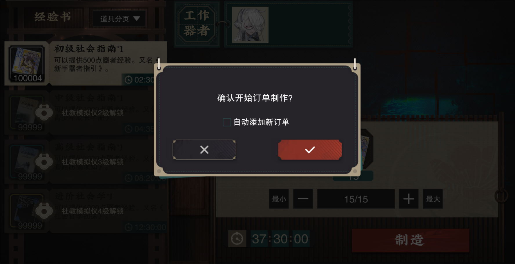 1.3(上)版本开启后,【工作间】-【材料订购机】及【办公室】-【社教模拟仪】中的订单结束后将自动重复制造,减少大家的重复操作。当收藏家们选择道具进行制造,则会弹出二次提醒,大家也可根据自身需要进行手动调整。
