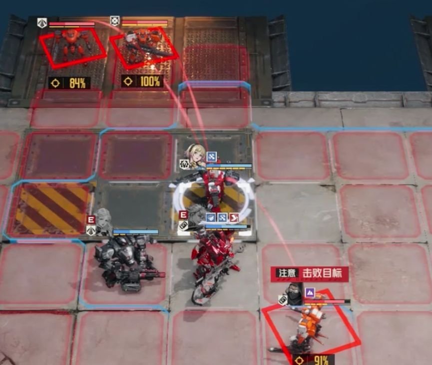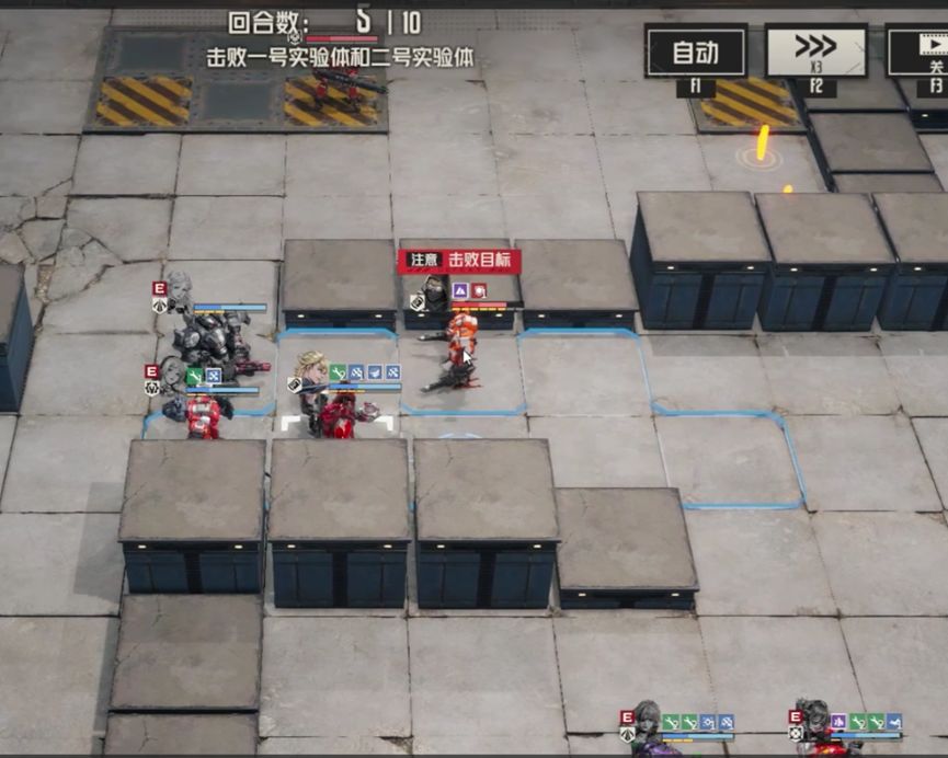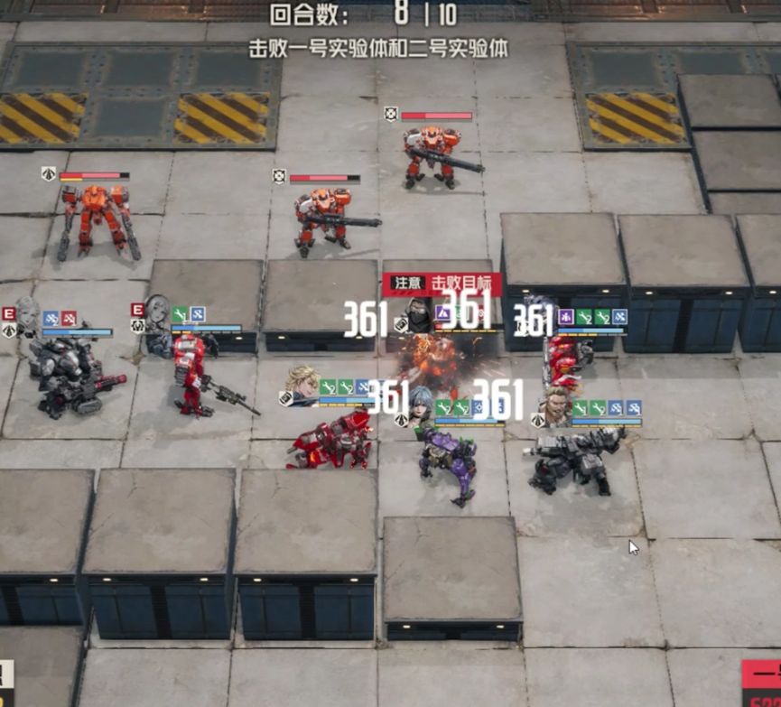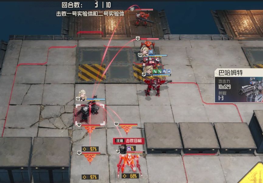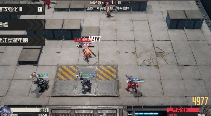 玛丽先上前攻击重机枪兵,不打实验体,随后凯莉攻击实验体施加命中躯干上升,威廉收掉重机枪兵,攻击实验体