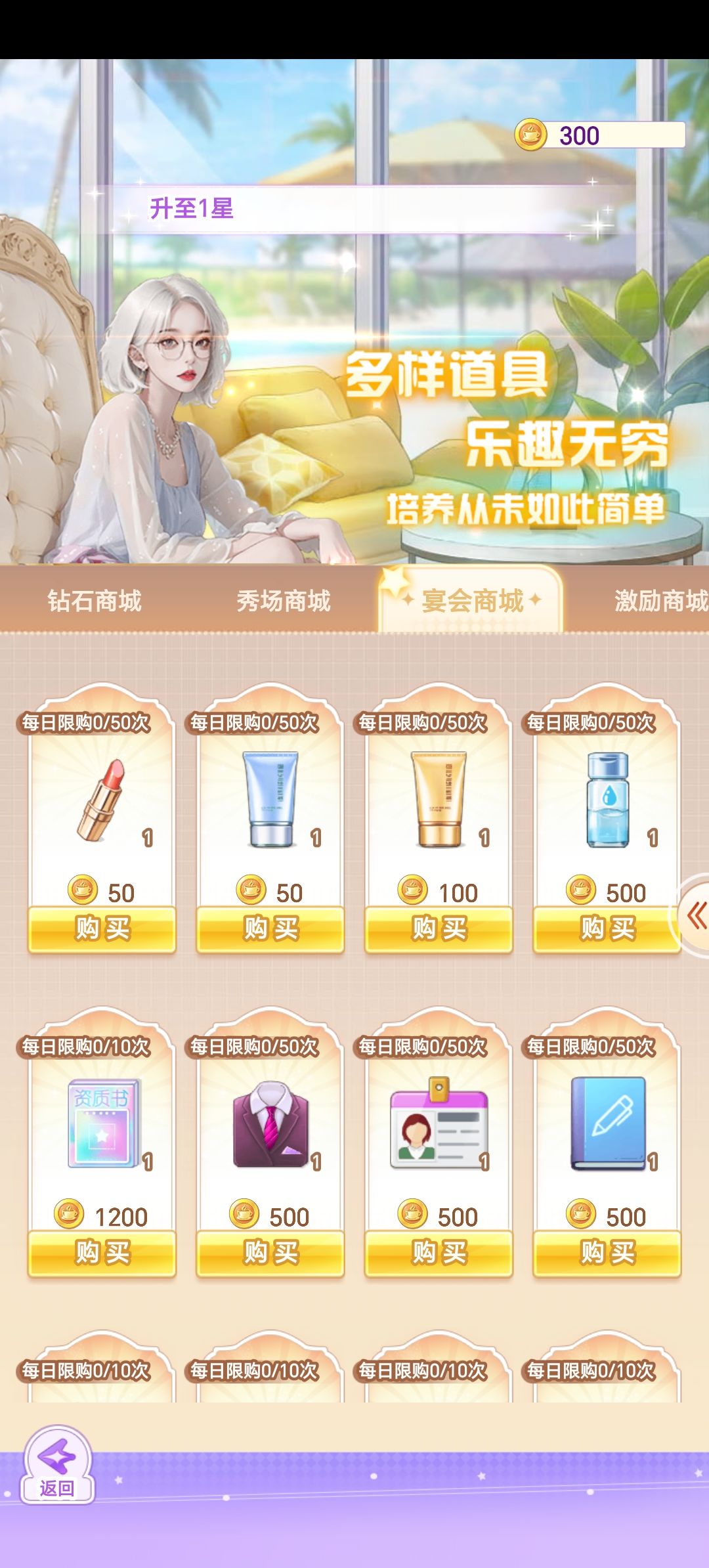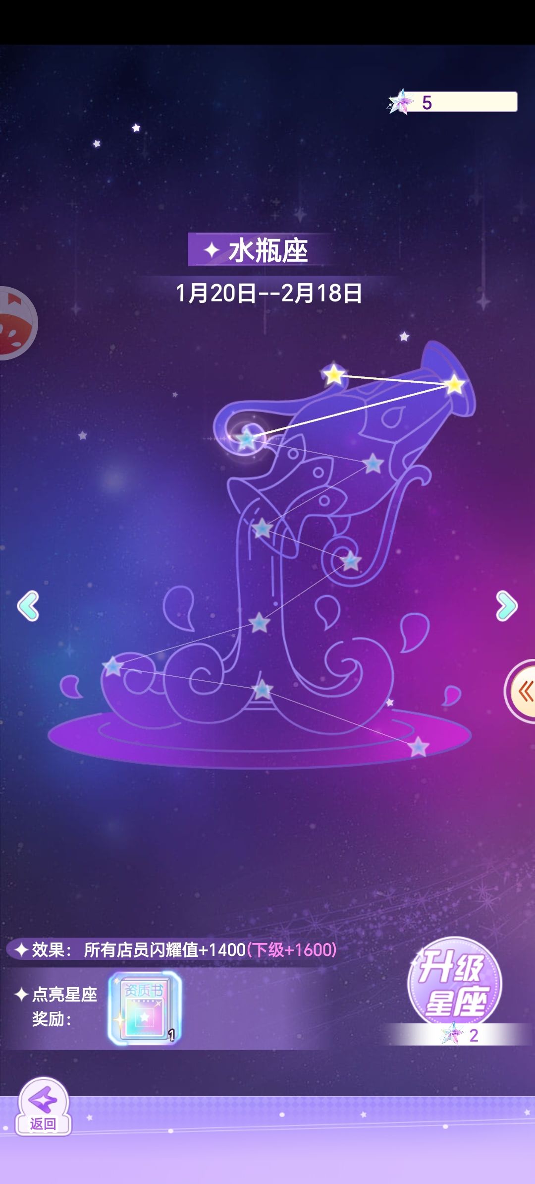 图七是星座,可以靠穿搭比赛获得右上角的星星道具,升级这个水瓶座可以获得所有员工闪耀值的加成。