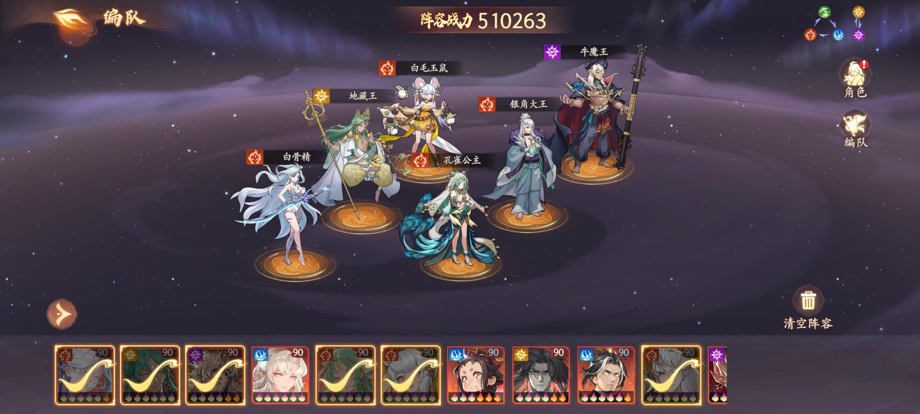 阵容如图,没有最好的固定阵容,还是要根据个人卡池选择,除了必上的牛魔和孔雀。
