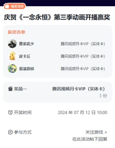 龟爷来恭喜以下3位天骄在本次社区活动中获得奖品,没有中奖的天骄也不必气馁!今后龟爷保证会持续带来更多的福利,大家可关注《一念永恒:少年追梦》留意社区内的更多活动![[表情_送花]](https://img-tc.tapimg.com/market/images/68b3dc8473df915ad2b85da5efef4f56.png)