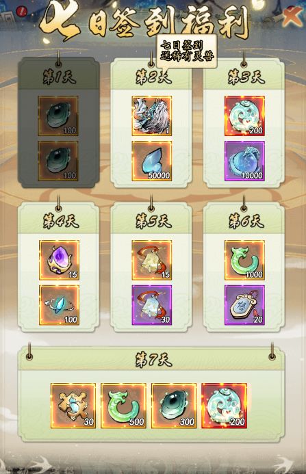 登陆签到就可以获取奖励哦每天的奖励都是不同的,稀有灵兽、稀有法器......真是让人期待满满呀。除了七日签到以外也是有累计签到可以领取福利的哦每天上线就可以在累计签到页面进行签到领取奖励并且会在累计签到了5天、12天、18天、25天获取到额外的奖励哦~