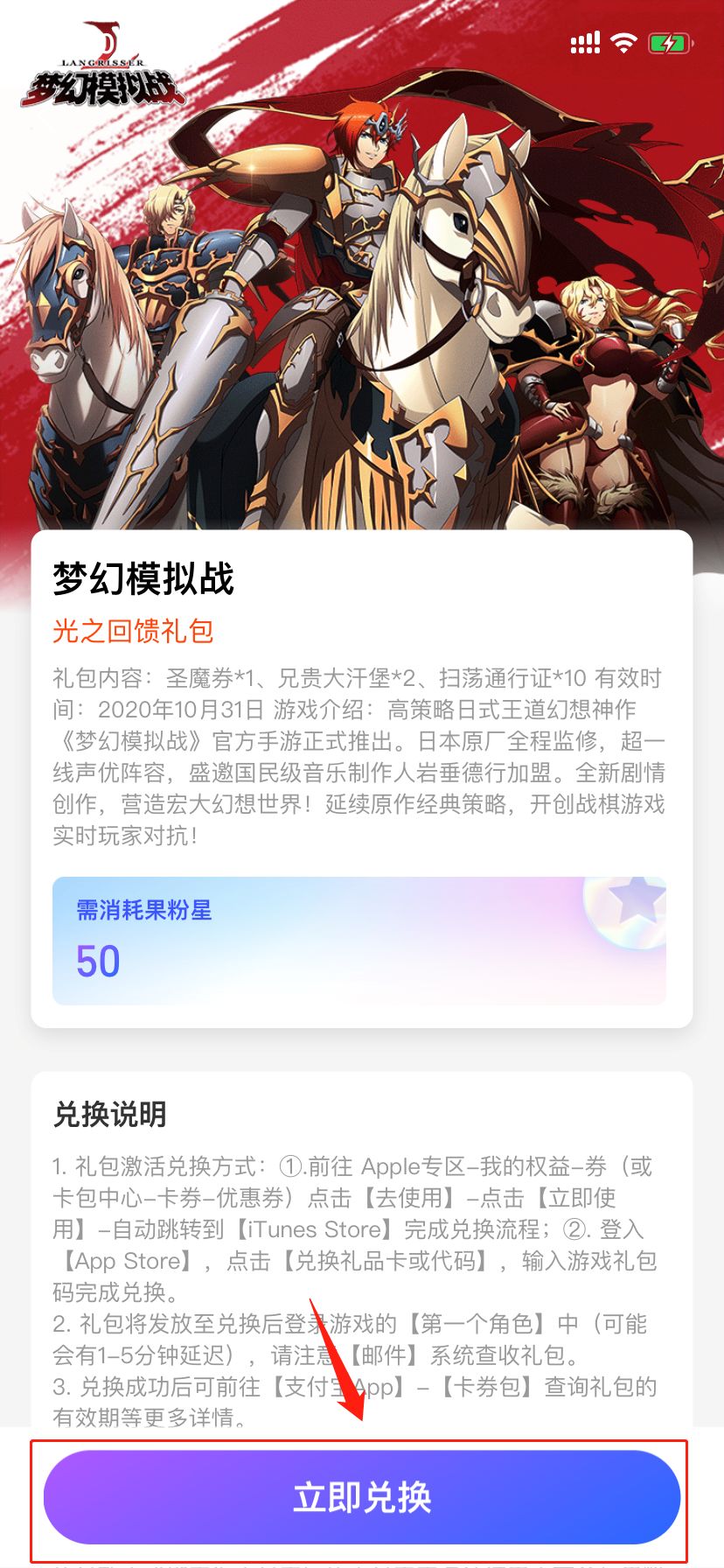 2.在专区中找到“梦幻模拟战光之回馈”礼包,进入礼包详情页后,点击“立即兑换”即可获得Apple兑换码。