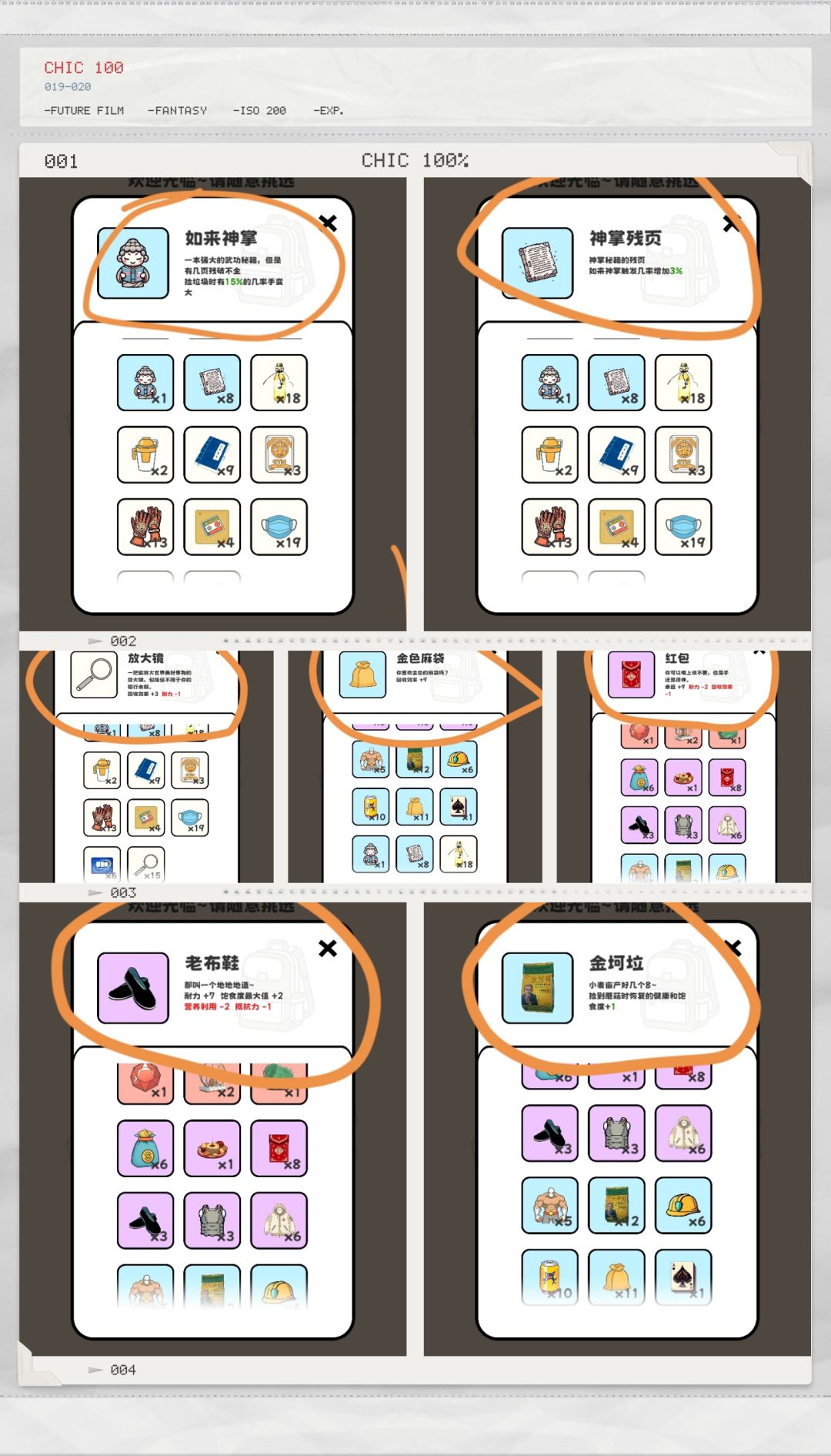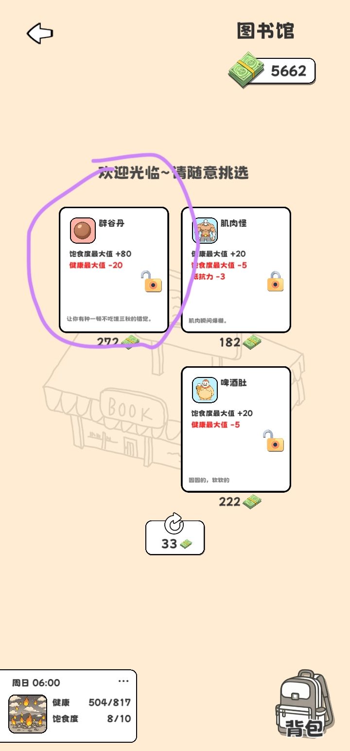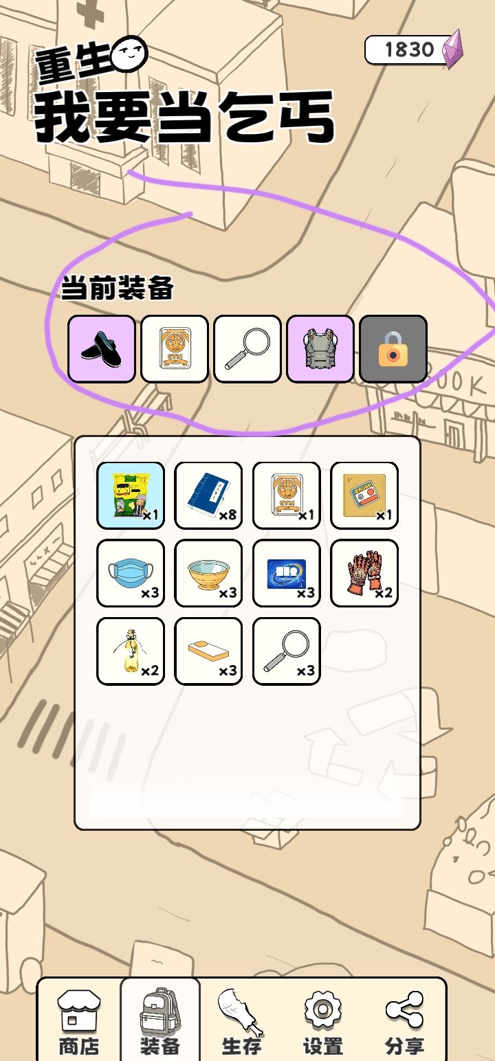 自己玩了几天,有几个心得,向新手分享一下,1.新手教程一定要学要不然你会很懵懂2.睡觉大概率会把健康补满,但会消耗饱食度3.新手尽量囤耐力,抵抗力,回收效率,护甲。属性作用:耐力:提高翻垃圾桶的时间比如第1张图右上角画圈处(最高应该是一分钟)护甲:高了之后可以免疫老鼠和碎瓶子伤害。抵抗力:食物来自垃圾桶会扣健康值抵抗力高的话就不会扣。回收效率:越高回收垃圾的钱就越多。第2张图画圈处都是可以点的。图书馆里想要的道具可以锁定。点那个锁就行。防止那个道具刷新比如第3幅图。第4幅图是我比较推荐的道具。结束游戏之后。可以点下方第1个模块(商店),可以抽奖,抽奖要货币(忘了名字)通关一次大概1000货币(应该,不确定)可以看广告解锁装备栏(不推荐用货币买)第5幅图画圈是我推荐的,第2个人物医生:抵抗力高,饱食度消耗多。第3个人物蚂蚁:耐力高。幸运高,但饱食度最大值只能是10不会增加或减少。比如第6幅图买了那个道具也不会增加饱食度不要白白浪费钱,并且不能睡觉,一睡觉就会死(饱食度不高,睡觉就会死)垃圾桶里有绿色的小蘑菇。可以增加健康值和饱食度,所以蚂蚁补充健康值,只能吃蘑菇,第4个人物(名字忘了):健康值1000