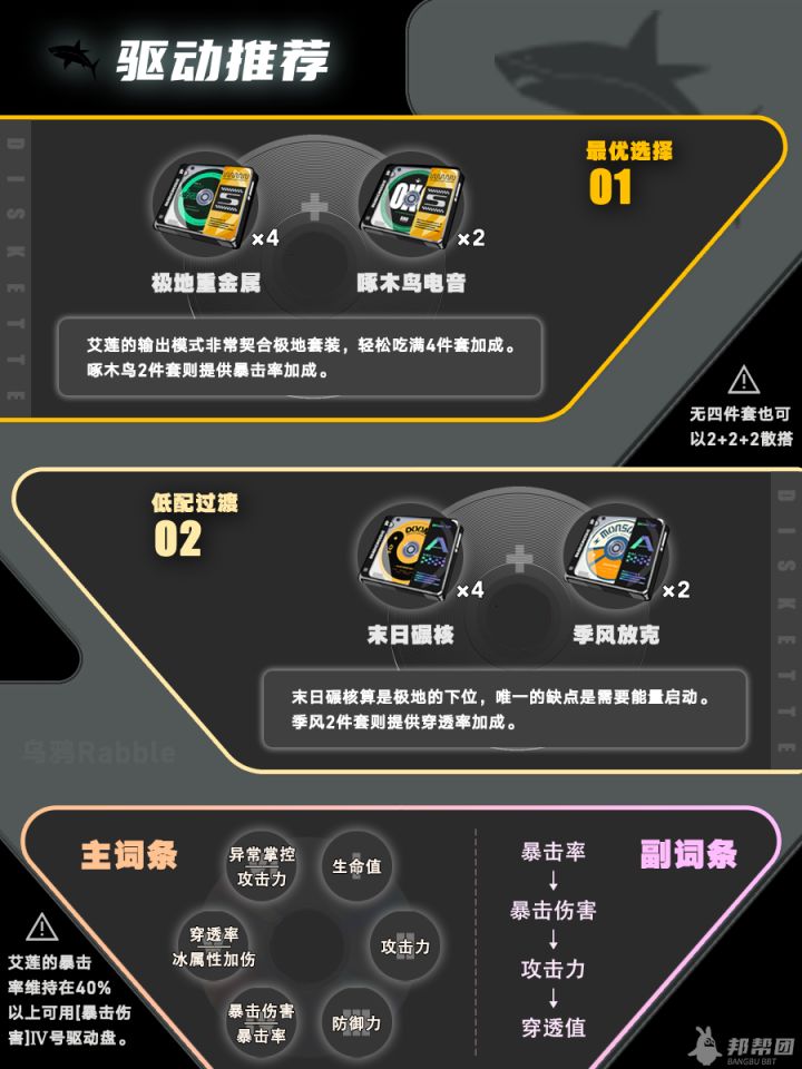 2. 驱动盘:极地重金属+啄木鸟电音 五、队伍搭配 1. 艾莲+狼哥+苍角:纯冰系队伍,适合主打冰弱点敌人,但成本较高。
