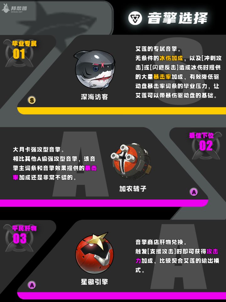 4. 闪避:Lv.6 四、武器选择 1. 音擎:S-深海访客为其专属武器,能提供较高的输出加成。