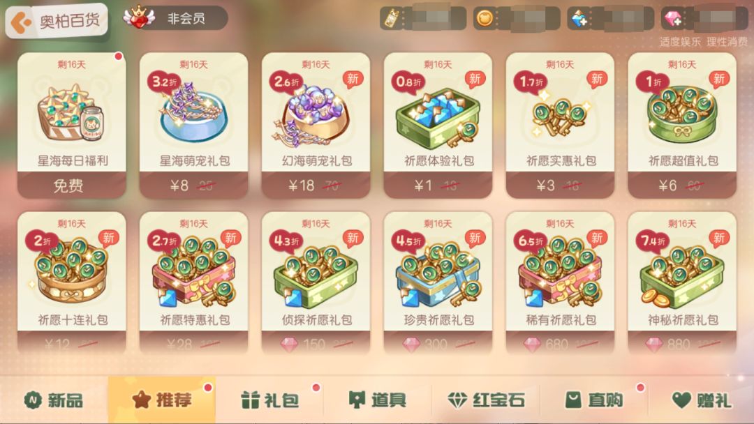 奥柏百货上架全新限时礼包——「祈愿」系列、「萌宠」系列折扣礼包,限时折扣优惠商品不可错过!