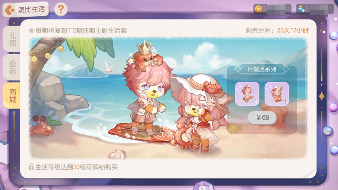 温馨提醒:购买本次两套返场装扮「巨蟹座夏日套装」「巨蟹座假日套装」不等同于解锁本期星座生活系列的「精致生活」和「豪华生活」。