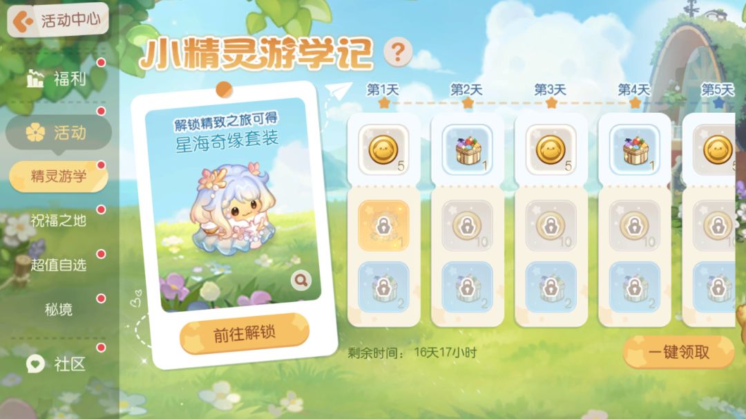 活动介绍:小精灵游学记限时开启!活动期间内,奥比们通过每日登录即可领取「精灵果自选箱」「精灵硬币」奖励;购买解锁精致之旅,可获得小精灵限定装扮「星海奇缘套装」和「晶钻」奖励。购买解锁豪华之旅,还可获得精灵房型「海灵潜水艇」和「晶钻」,喜欢的小奥比快快行动吧!