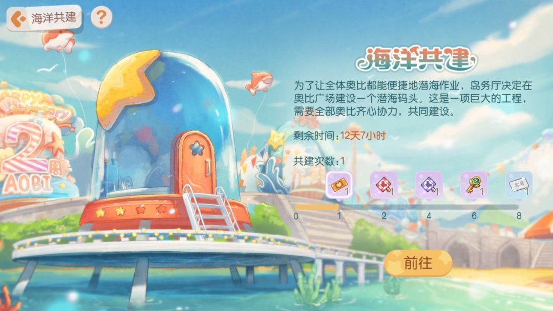活动介绍: 为了让全体奥比都能便捷地潜海作业,岛务厅决定在奥比广场建设一个潜海码头。这是一项巨大的工程,需要全部奥比齐心协力,共同建设。