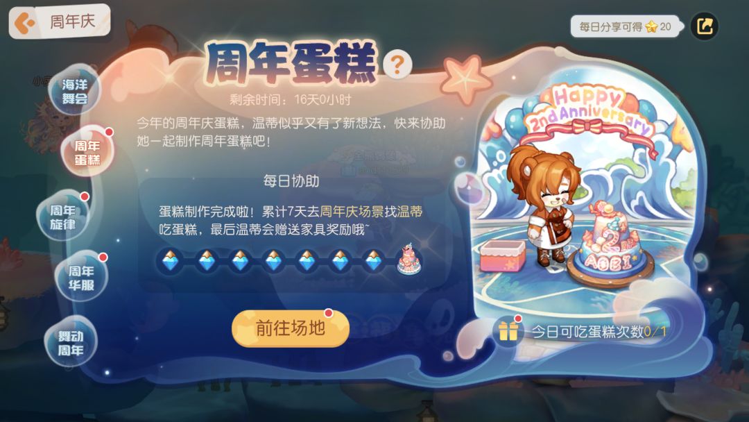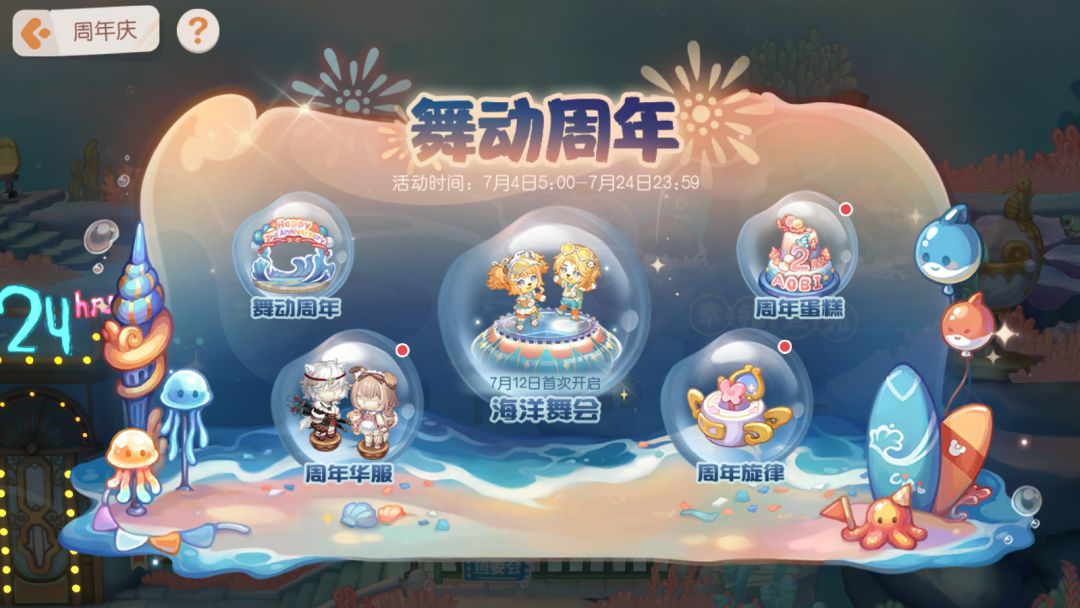 活动介绍:今年的周年庆蛋糕,温蒂似乎又有了新想法,快来协助她一起起制作周年蛋糕吧!小奥比们在制作周年庆蛋糕的过程中可获得丰厚奖励,坚持制作可获得「二周年星海蛋糕」、「时空之钥」等奖励,当蛋糕完成后,小奥比们每天吃蛋糕可获得40「晶钻」,可持续七天,七天后还可获得「海洋蛋糕嘟嘟乐」家具。