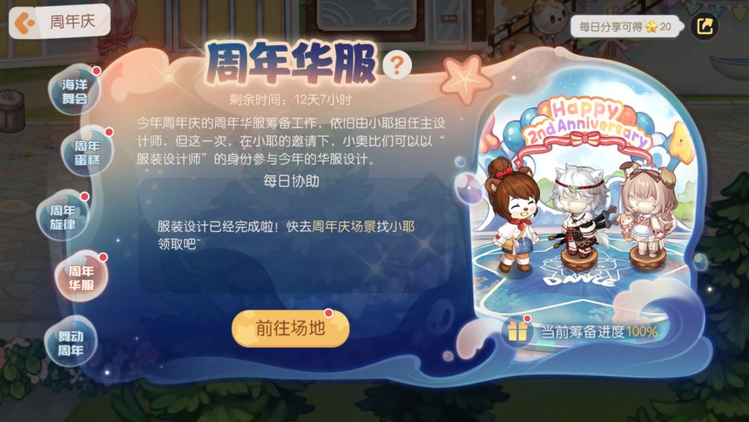 活动介绍:今年周年庆的周年华服筹备工作,依旧由小耶担任主设计师,但这一次,在小耶的邀请下,小奥比们可以以“服装设计师”的身份参与今年的华服设计。小奥比们可以通过提交材料的方式帮助小耶制作周年华服,制作华服的过程中还能获得进度奖励,到7月12日5点后,小奥比们可以领取周年华服礼物「奶咖小狗套装」和「狼族少年套装」!