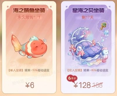 「海之萌鱼坐骑」常驻上架、「星海之贝坐骑」限时上架,购买后可乘坐坐骑在海洋内畅游,偷偷告诉小奥比们,不同坐骑在海内有增加不同移速的效果哦。购买「星海之贝坐骑」除了额外获得十个时空之钥,也还可邀请奥比的朋友一起遨游哦,喜欢的小奥比们快快行动吧!