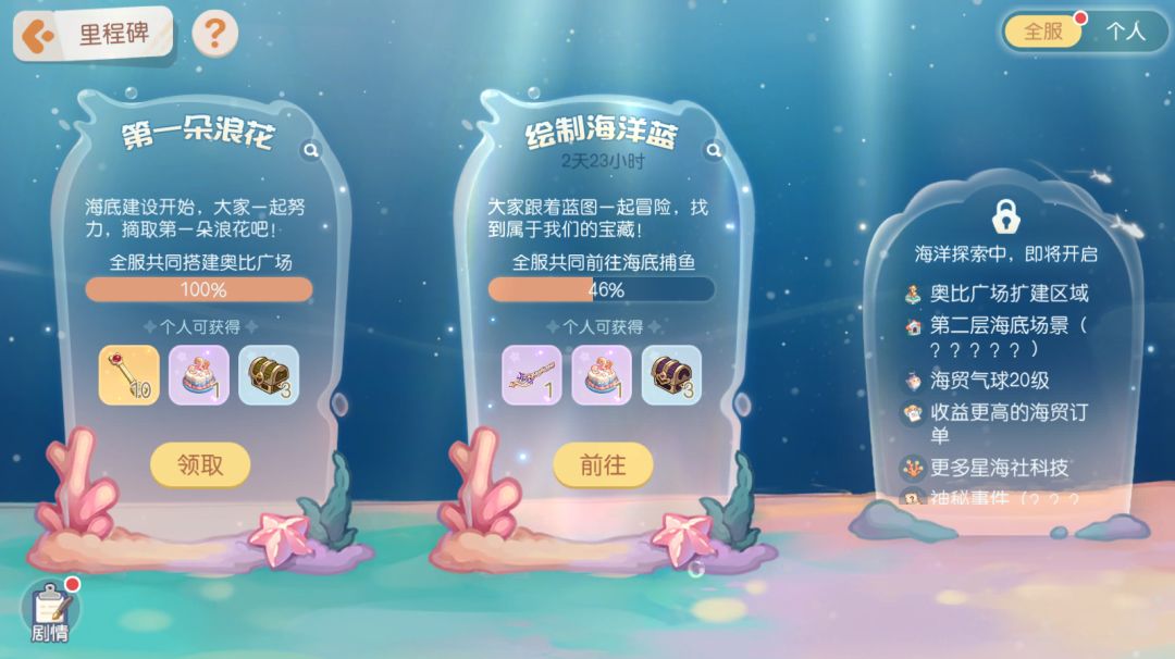 【新玩法:全服里程碑共建】上线时间:7月4日更新后随着海底世界的出现,岛上将会出现多个全服里程碑世界任务,达到15级的小奥比可进行任务,指定任务进度达到100%即可领取全服奖励哦~里程碑共建进度还将关联海底世界和奥比岛广场的扩建进度,小奥比们积极参与共建,可解锁更多海洋区域和奥比广场区域。