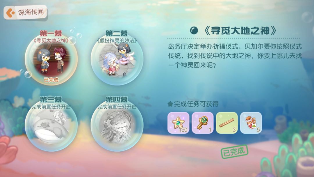 活动介绍:为求海洋开发计划一帆风顺,岛务厅打算举办海陆祈福仪式,你受邀成为筹办者。按照传统,你需要为仪式请来传说中的大地之神。活动期间共推出四幕剧情任务,小奥比们完成剧情后即可领取奖励。