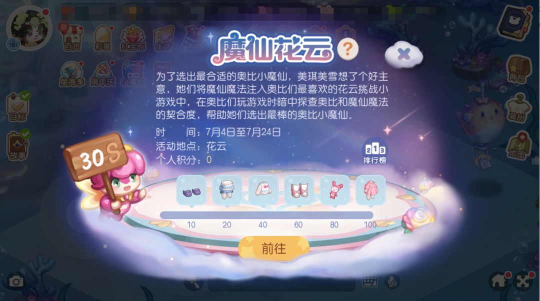 活动介绍:为了选出最合适的奥比小魔仙,美琪美雪想了个好主意,她们将魔仙魔法注入奥比们最喜欢的花云挑战小游戏中,帮助她们选出最棒的奥比小魔仙。魔仙花云小游戏限时开放,小奥比们快前往花云参与挑战吧!达成相应进度可获得「美琪日常套装」和「美雪日常套装」。