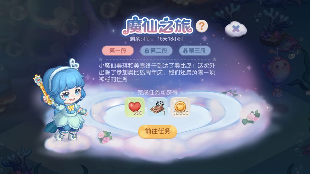活动介绍:因为严莉莉和美琪、美雪的优异表现,魔仙女王开始考虑在魔仙星球之外鼓励更多小朋友们成为小魔仙……在活动期间,小奥比们完成魔仙之旅剧情,可获得丰富活动奖励!