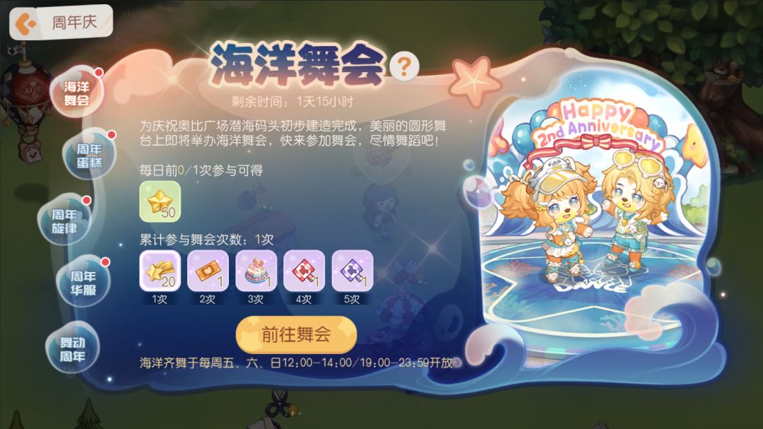 期间(全天开放自由舞)每周五、六、日中午12:00-14:00/晚上19:00-23:59期间(海洋齐舞时刻)活动介绍:岛务厅为庆祝周年庆,将举办舞会,活动期间,小奥比们可以在奥比广场单人独舞或邀约他人共舞。此外,在特殊时间段将会开放齐舞模式,届时,所有在舞台的小奥比们将会共同演绎同一舞蹈。活动期间,参与「海洋舞会」即可获得「爱心」奖励,累计完成参与派对达到一定次数还可以获得「传记借阅证」「晶钻服装彩蛋锤」等奖励哦!小奥比们别错过啦!