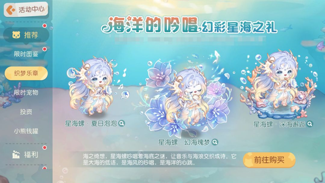 海洋细细吟唱,音乐与海浪交织成诗,幻彩星海之礼大放送,「星海螺乐器礼包」、「泡泡幻音铃礼包」、「深海幻音铃礼包」、「瑰梦幻音铃礼包」限时上新,购买可分别获得「星海螺」、「星海螺·夏日泡泡」、「星海螺·深海邂逅」「星海螺·幻海瑰梦」和「时空之钥」,喜欢的小奥比们可不要错过啦。