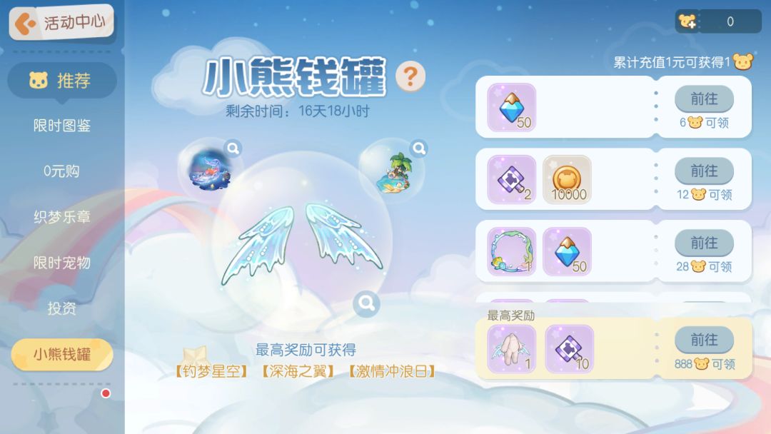 活动介绍:小熊钱罐限时回馈活动上新,在活动期间,每往游戏内储蓄1元,即可获得1点小熊积分。当小熊积分达到对应的奖励积分档位时,可解锁对应的进度奖励,丰厚的奖励包括家具「激情冲浪日」、「钓梦星空」、分享物「章鱼冰淇淋」和「蜂蜜水晶塔」、限定称号「小美熊鱼」、头像框「海底小镇」、翅膀「深海之翼」、背景卡「夏日派对背景」等。