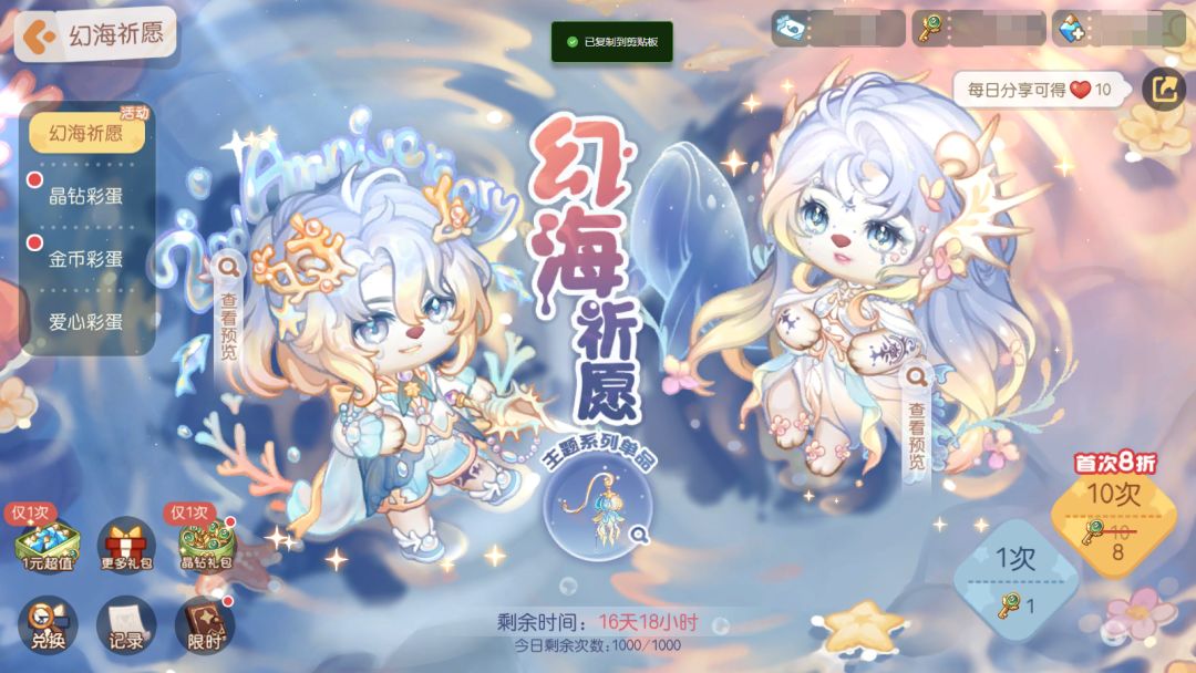 活动介绍:星海主题彩蛋“幻海祈愿”限时登场!彩蛋上新送福利!彩蛋奖励包含晨星品质时装「深海之鲸套装」、「大地之神套装」以及家具「海灵祈福」系列等全新礼物!还有典藏品质的「悠闲海獭套装」、「活力海豹套装」和家具「潮熊沙滩派对」系列,装扮散件「浪漫海洋泡泡」「浪漫水母提灯」等奖励限时获取哦!温馨提示:本期彩蛋中晨星品质和典藏品质的装扮(除“美颜”分类下的装扮和部分装扮)皆可进行染色。