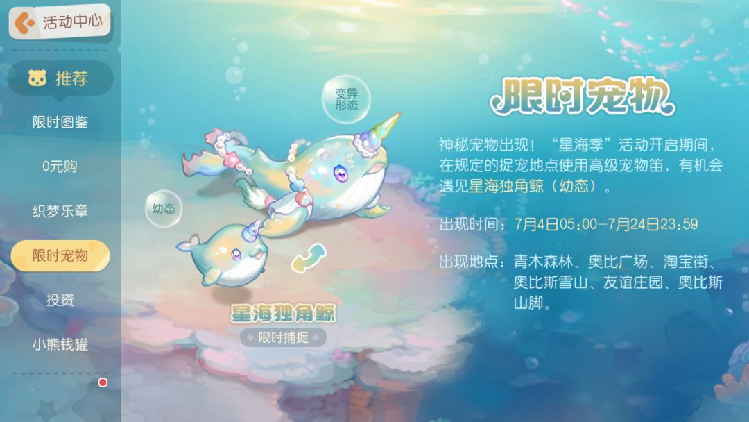 活动介绍:神秘宠物出现,活动期间限定宠物「星海独角鲸」将会出现在奥比岛。前往岛内捉宠地点,使用高级宠物笛就有机会和它相遇哦(注:宠物不能被带进海底场景哦)。