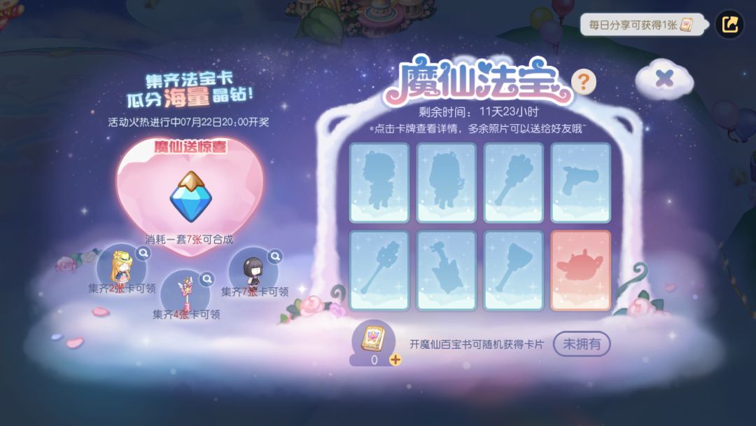 活动介绍:法宝卡以魔仙百宝书的形式散落在岛屿上,奥比们快帮美琪美雪把丢失的法宝卡找回来吧!奥比们可通过完成日常任务获得随机的法宝卡,1张巴啦啦能量卡可兑换成任意1张法宝卡,重复的卡片可赠送给好友。达成对应进度可解锁「小蓝日常套装」和「严莉莉日常服装」和「巴啦啦魔法灯柱」等。