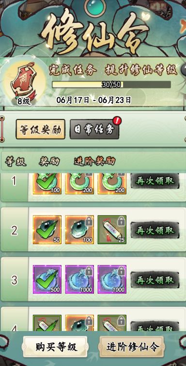 在前期完成日常任务即可提升修仙等级,提升修仙等级之后即可领取到奖励,如果有更高的需求也是可以考虑一下进阶奖励的,只需要进阶修仙令即可获取到进阶奖励。如果您的等级并没有达到您预想的范围,您也是可以在修仙令开启五天后使用仙玉购买修仙令等级快速的升级,直接解锁对应等级的奖励哦