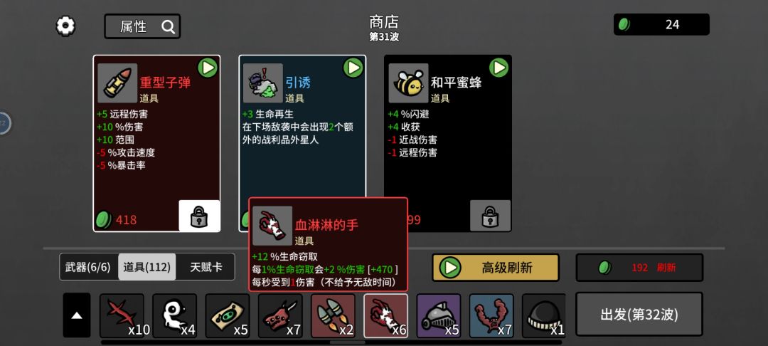 道具减吸血的,和减移动速度的尽量别买。因为这两个属性有红色道具,一个加N多的伤害加成,一个顶几百几千个其它类型道具。