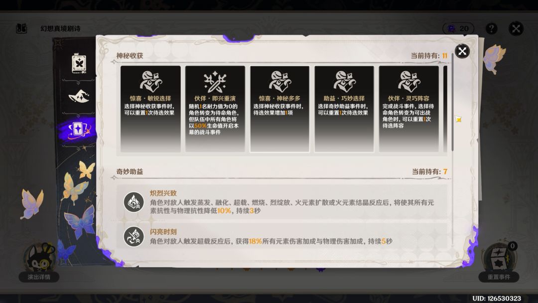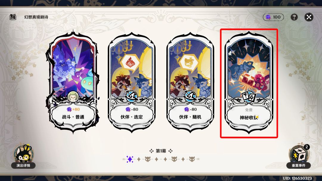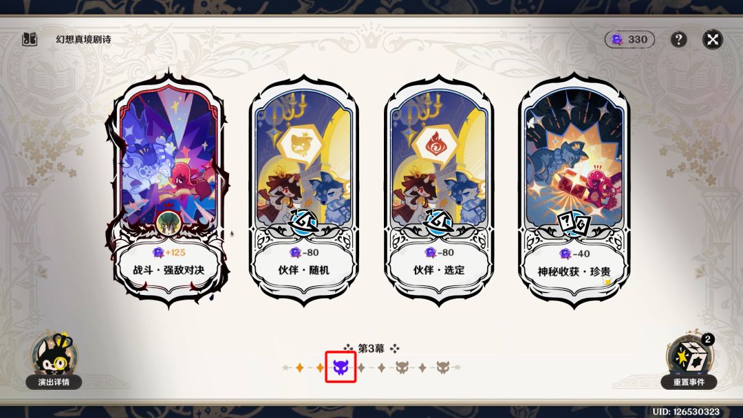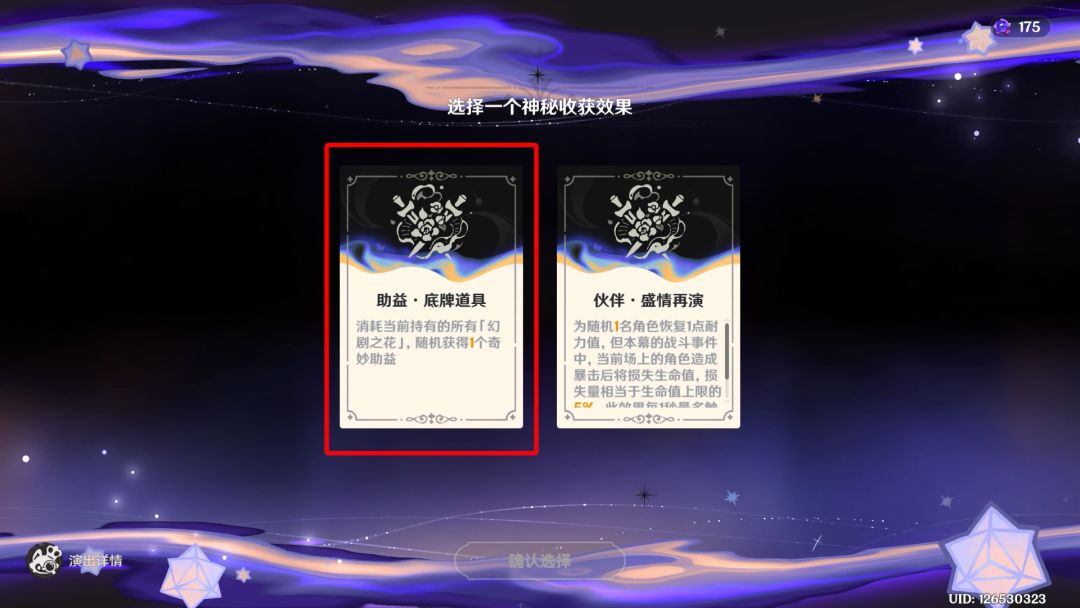 第一个BOSS之前,多选获得幻剧之花的战斗或者是伙伴,有神秘收获的优先选择神秘收获,不要用重置