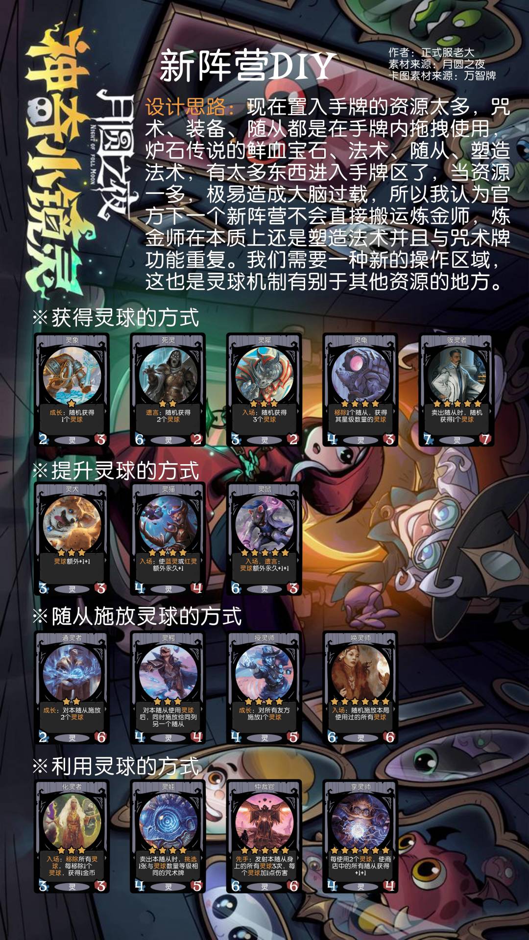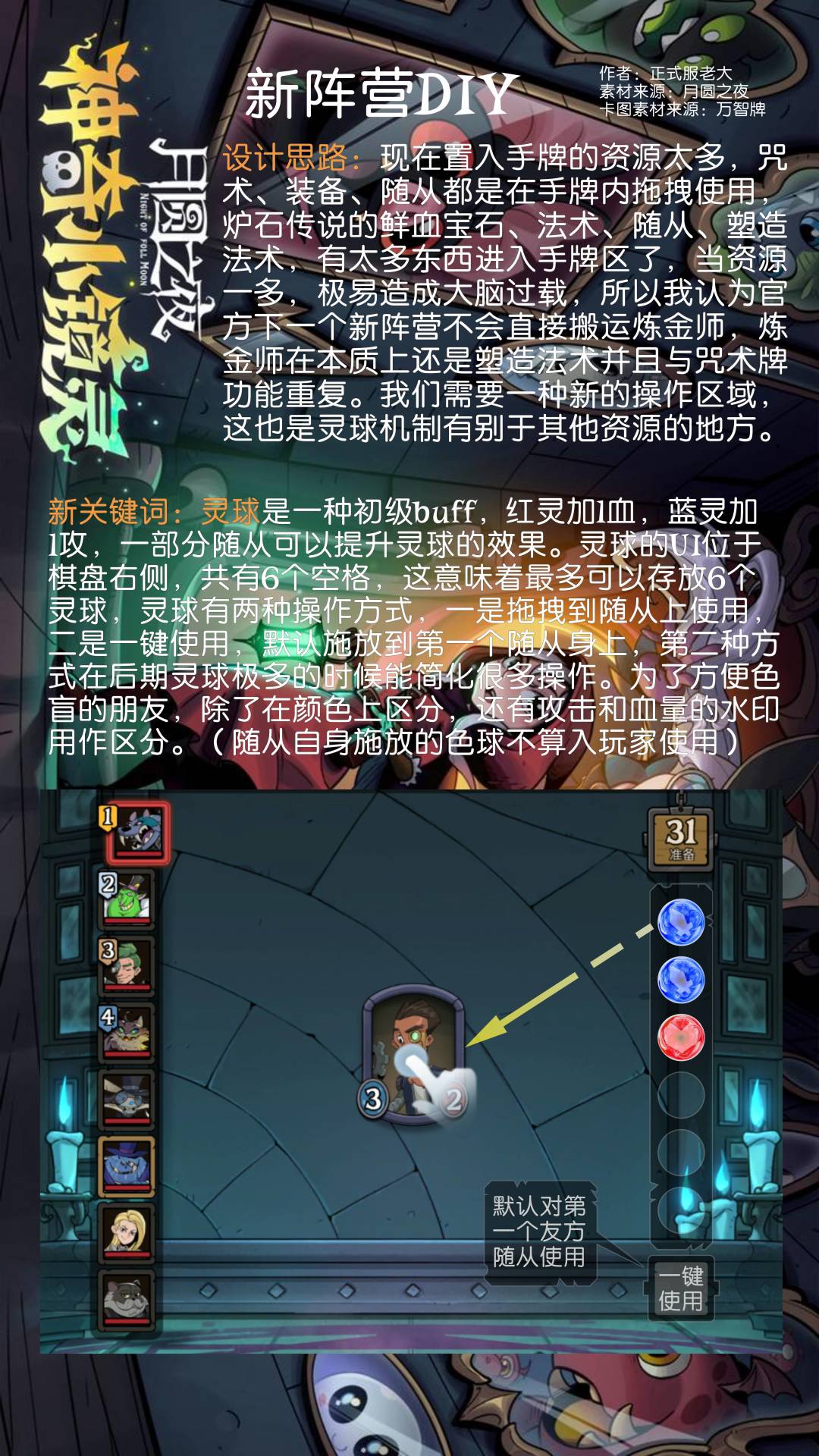 设计思路:现在置入手牌的资源太多,咒术、装备、随从都是在手牌内拖拽释放,炉石传说的碎片、法术、随从、塑造法术,有太多东西进入手牌区了,当资源一多,极易造成大脑过载,所以我认为官方下一个新阵营不会直接搬运炼金师,炼金师在本质上还是塑造法术并且与咒术牌功能重复。我们需要一种新的操作区域,这也是灵球机制有别于其他资源的地方。(卡图来源:万智牌)