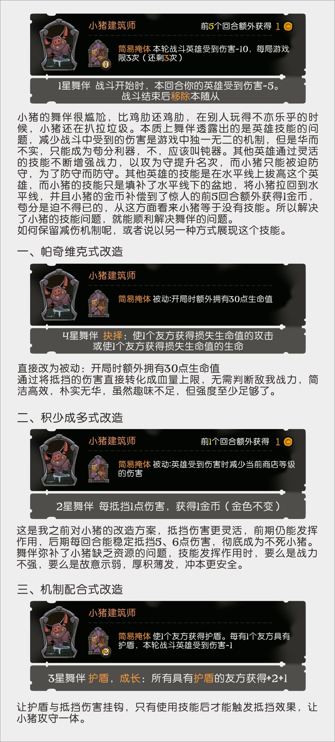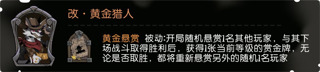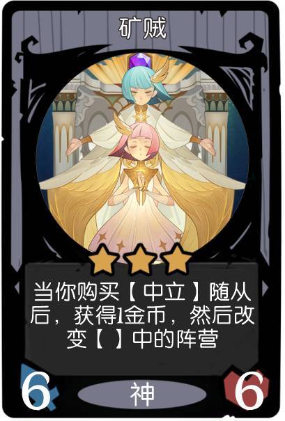 这个设计也放在了官方举办的DIY设计比赛里,是我比较喜欢的一个设计。在其基础上进行了部分修改,最明显的修改就是星级从五本降到了三本,因为之前过高估计了原设计的强度,在技能效果上,类似于全阵营的佣兵,缺点也很明显,他不像炉石中的霍格,【矿贼】不会限定一种阵营,并且因为月圆之夜的商店格子只有三个,还有可能刷新出装备,导致【矿贼】不会发挥得很好。趣味是有的,强度是堪忧的,即使放在三本,其可以发挥效果的时机也很有限,即使金矿贼在某些时刻可以白嫖随从,也显得不强。