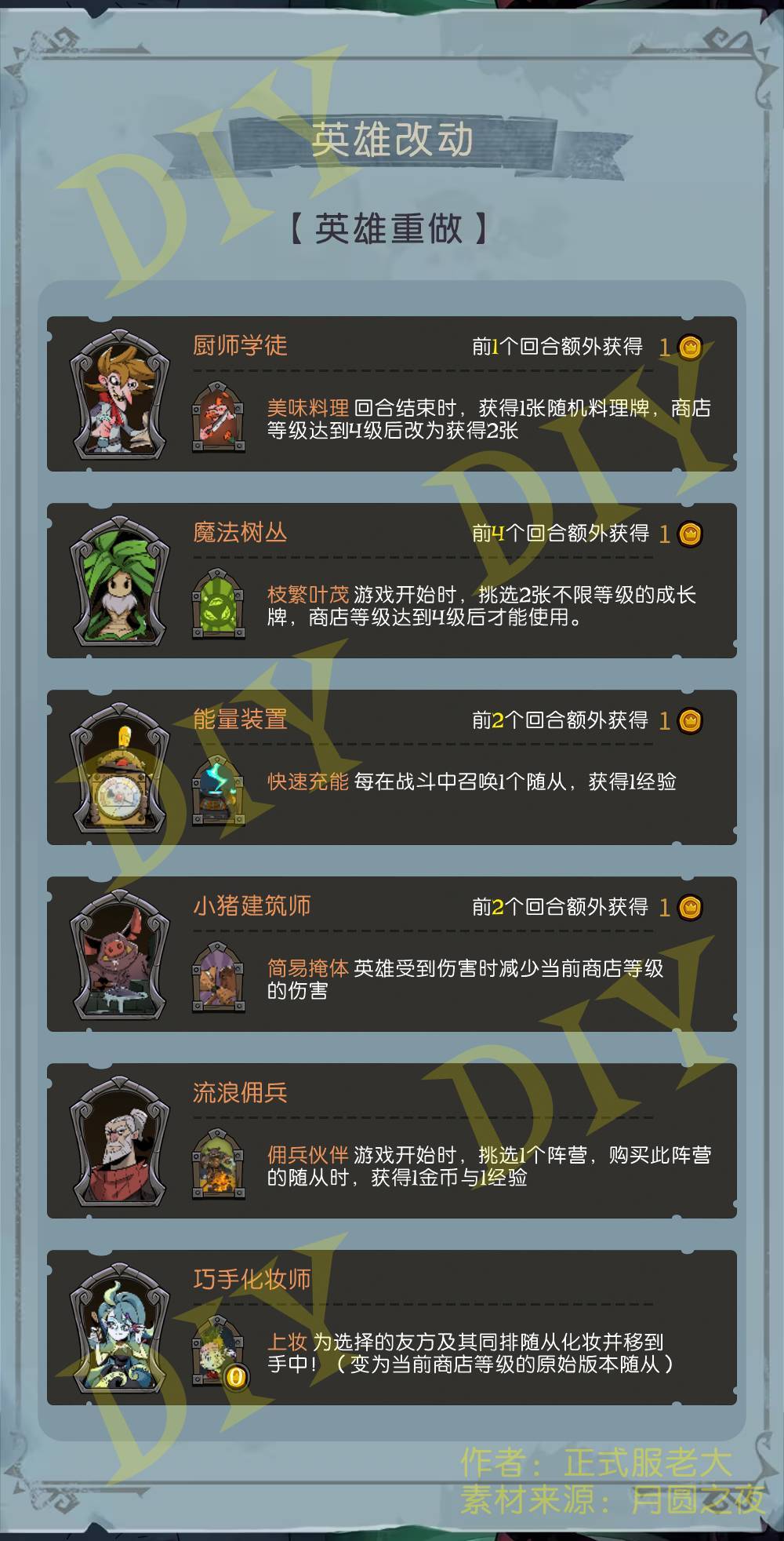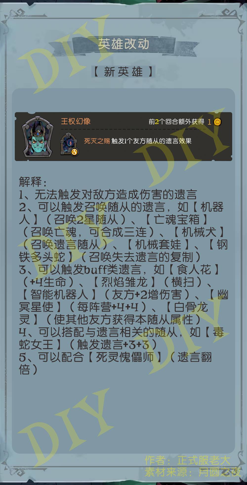 设计思路:游戏初期的英雄机制都挺简单粗暴的,月圆是学习的酒馆战棋,炉石酒馆的英雄大多也是平平无奇,从下版本的新英雄看来,月圆的设计渐渐开始摆脱这些束缚,新英雄会更有操作感,老英雄也在界限突破的路上